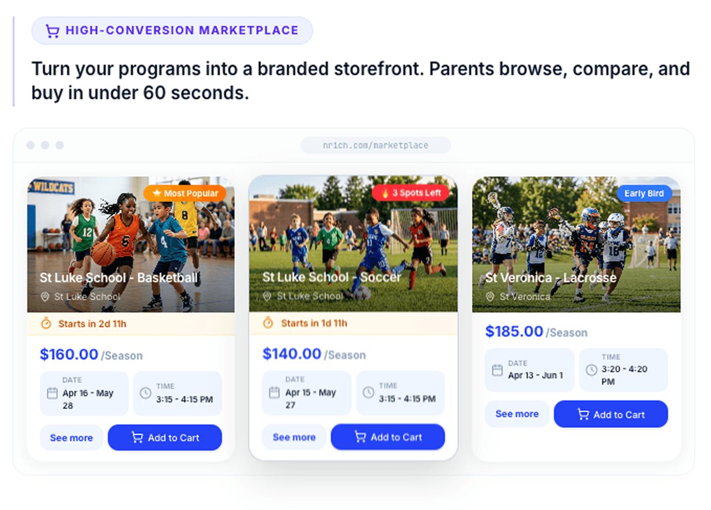 NRICH is a smart sports management platform that helps organizations manage programs, coaches, students, payments, and communications — all in one place.